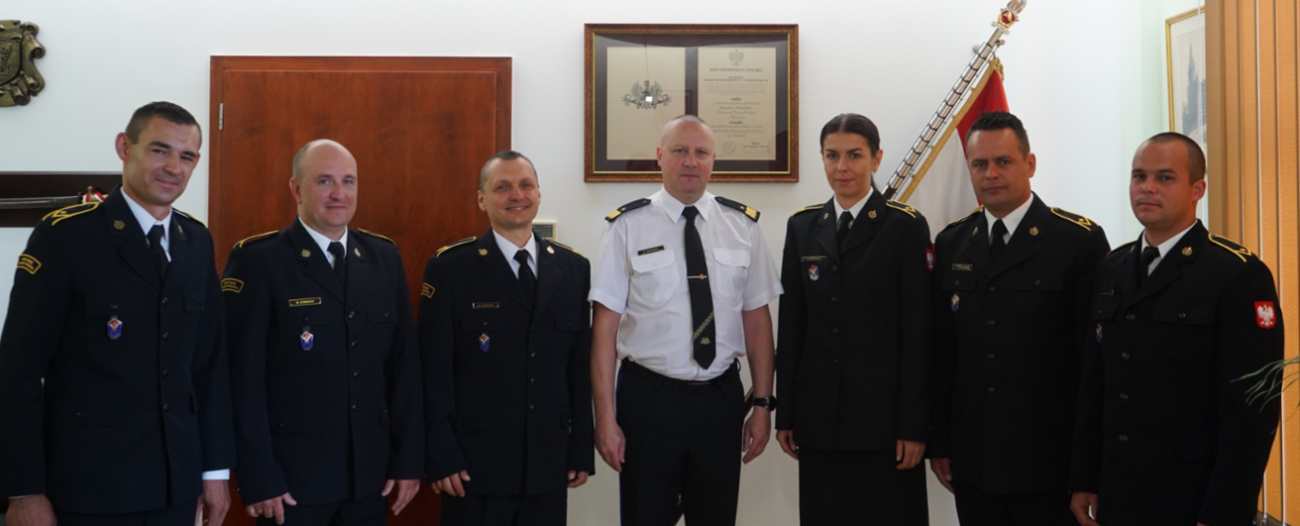 Na zdjęciu Marcin Dominiak (drugi z lewej) oraz strażacy z komendy wojewódzkiej, którzy ukończyli szkołę aspirantów, podczas spotkania u Komendanta Wojewódzkiego nadbryg. Dariusza Matczaka.