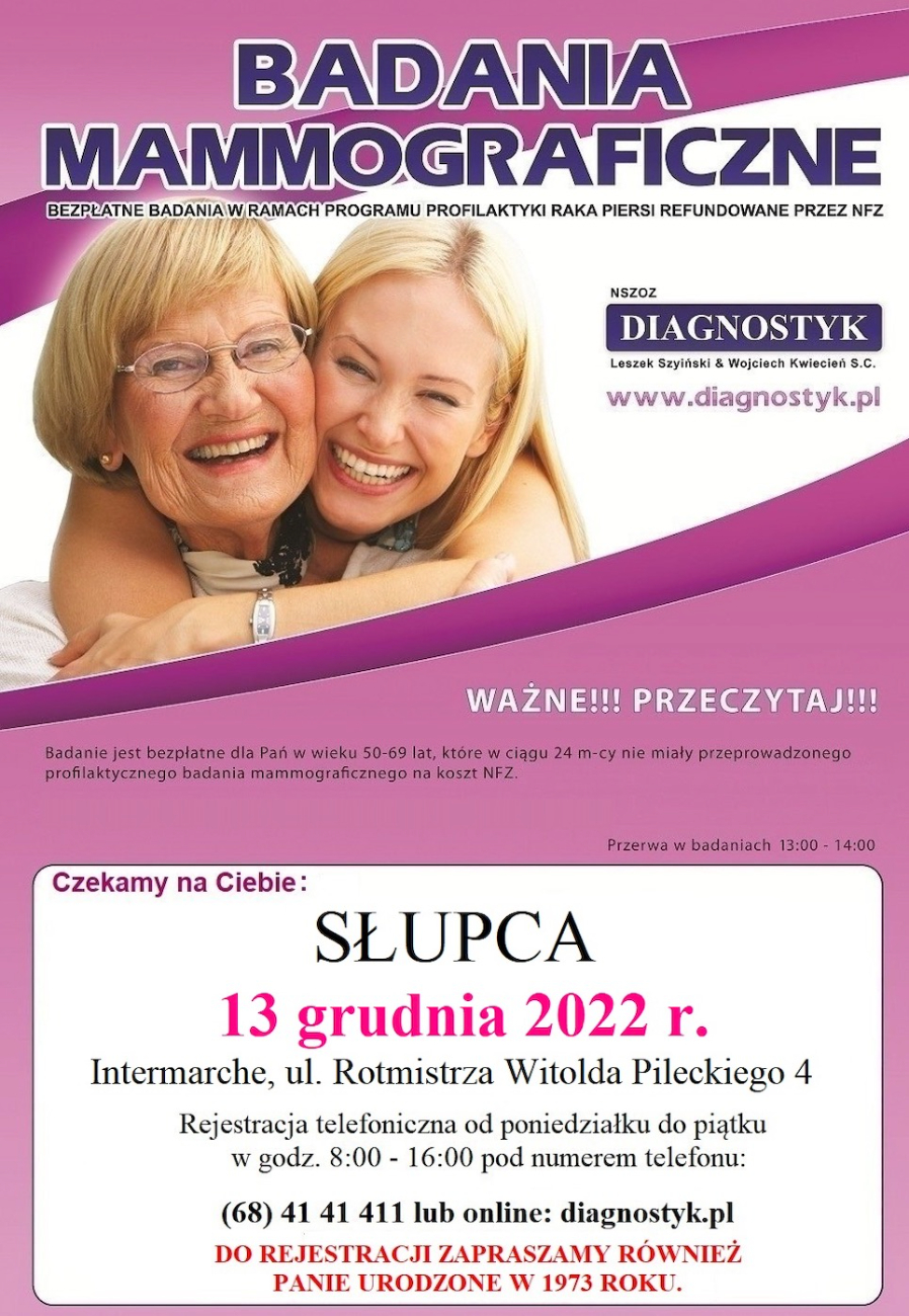 13 grudnia przy Intermarche w Słupcy przeprowadzane będą bezpłatne badania mammograficzne dla kobiet w wieku od 50 do 69 lat, które w ciągu ostatnich dwóch lat nie miały wykonywanych tego typu badań. Bardzo zależy nam na tym aby dotrzeć do mieszkanek urodzonych w latach: 1967 r.-1972 r. – te Panie mogą już wykonać badanie w ramach Populacyjnego Programu Wczesnego Wykrywania Raka Piersi.
