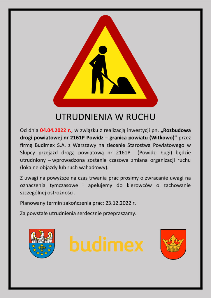 Od 4 kwietnia, w związku z rozpoczęciem prac rozbudowy drogi powiatowej Powidz – granica powiatu w kierunku Witkowa, przejazd drogą będzie utrudniony. Wprowadzona zostanie czasowa zmiana organizacji ruchu. – Na czas trwania prac prosimy o zwracanie uwagi na oznaczenia tymczasowe i apelujemy do kierowców o zachowanie szczególnej ostrożności – informuje w komunikacie Starostwo Powiatowe w Słupcy. Planowany termin zakończenia prac to 23 grudnia br. Szczegóły w komunikacie poniżej.