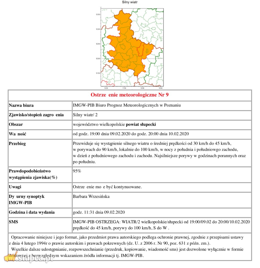 Instytut Meteorologii i Gospodarki Wodnej ostrzega przed silnym wiatrem, którego prędkość może wynieść od 30 do 45 km/h, a w porywach nawet do 100 km/h. Ostrzeżenie dotyczy powiatu słupeckiego. Wiać będzie dziś od godz. 19.00. Uważajcie!