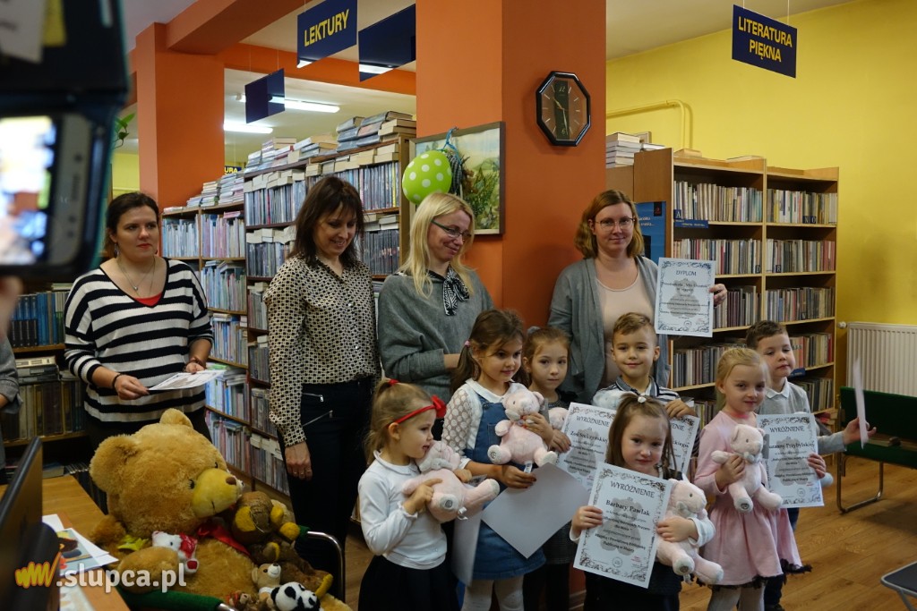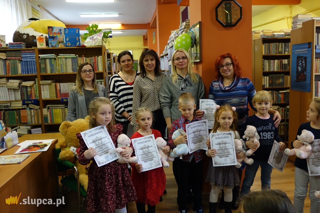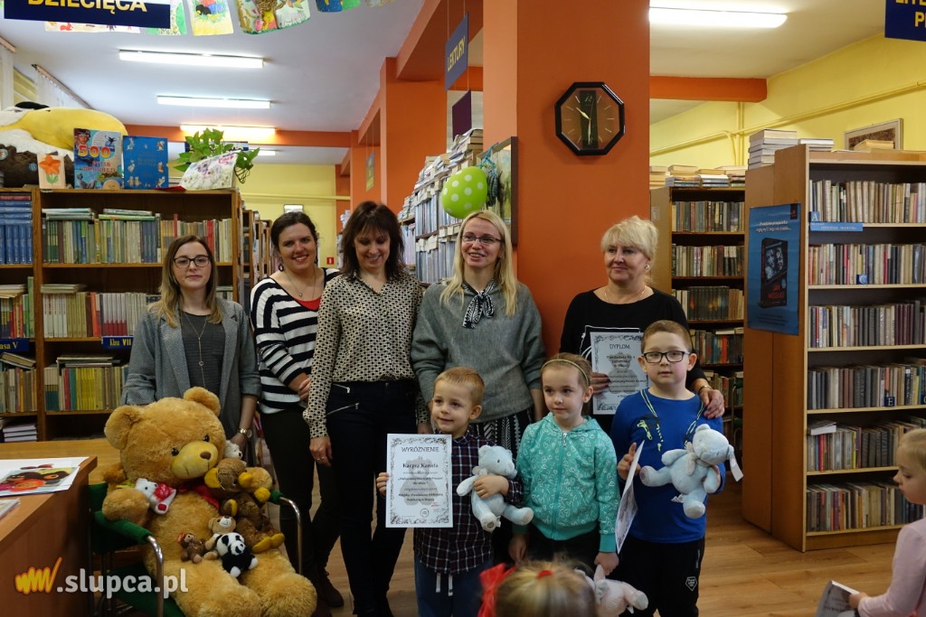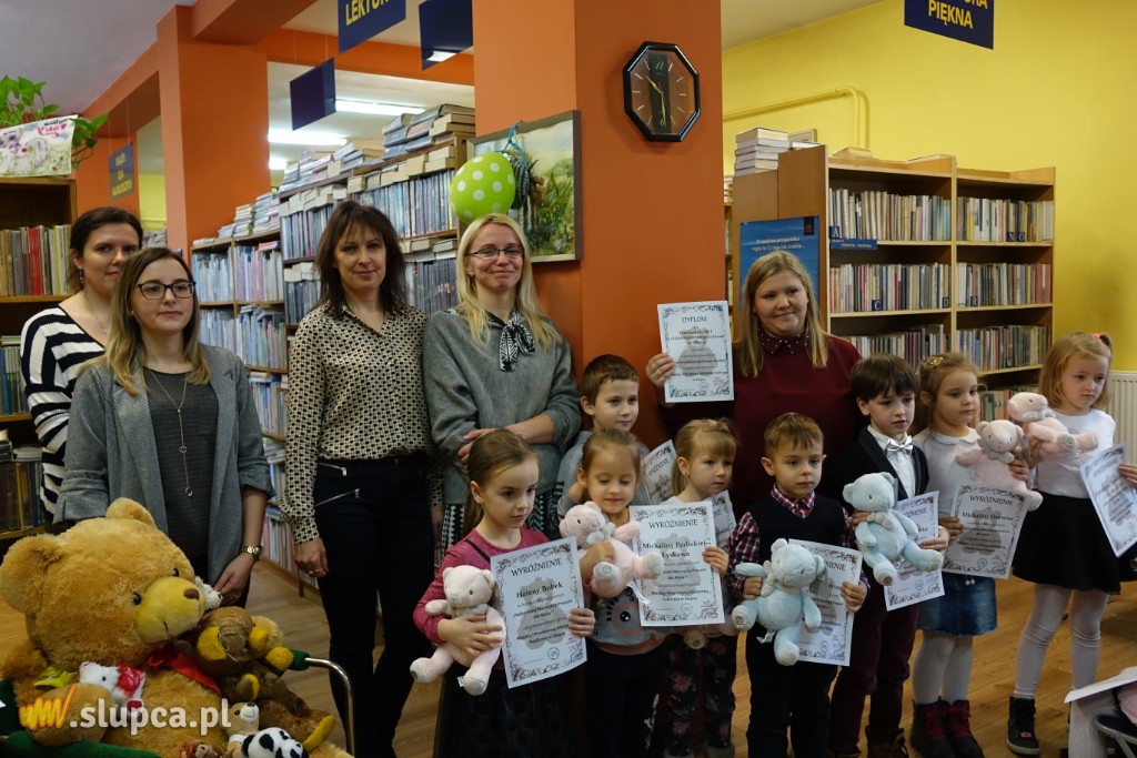 “Najbardziej niezwykły prezent dla Misia” to tytuł konkursu, który skierowany został przez Miejską i Powiatową Bibliotekę Publiczną w Słupcy do przedszkolaków w związku z obchodzonym 25 listopada Światowym Dniem Pluszowego Misia.Spośród 57 prac wyłoniono 25 laureatów.Trudnego zadania oceny prac konkursowych podjęła się Adrianna Olczak, nauczyciel ze Szkoły Podstawowej nr 1 oraz Karolina Waleryszak ze Szkoły Podstawowej nr 3. Praca komisji okazała się wyjątkowo trudna, ponieważ dzieci wykazały się niezwykłą inwencją twórczą. Prezenty dla Misia były przeróżne: od laurek, zabawek, miodu i serduszek, do posiadania prawdziwej rodziny i domu. Zanim dzieci odebrały nagrody w postaci pluszowego misia i pamiątkowe dyplomy, wysłuchały historii powstania maskotki opowiedzianej przez dyrektorkę biblioteki Annę Karpińską. Poznały portrety Misia Uszatka i Kubusia Puchatka, przedstawione przez autorów książek z tytułowymi bohaterami (“Bajki Misia Uszatka” oraz “Kubuś Puchatek i przyjaciele”). Bibliotekarka Anna Nowak przeprowadziła krótki test ze znajomości misiów, który przedszkolaki zdały wzorowo. Potrafiły rozpoznać wszystkich bohaterów na podstawie ilustracji.