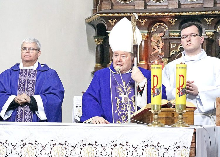 Na zdjęciu bp Bogdan Wojtuś przewodniczący mszy św. w intencji zmarłego ks. Marka Barlaka, proboszcza parafii w Giewartowie, kwiecień 2019.