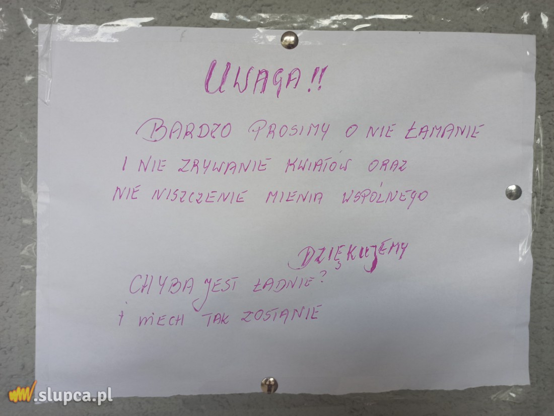 Blok przy ul. Traugutta 8 wyróżnia się w Słupcy. Wszystko za sprawą szczególnej dbałości o teren wokół budynku. To zasługa grupy mieszkańców i ich społecznej pracy. Do wszystkich, którym by przyszło do głowy dewastowanie ładnego terenu przed blokiem wystosowali oni apel. – Bardzo prosimy o nie łamanie i nie zrywanie kwiatów oraz nie niszczenie mienia wspólnego. Dziękujemy. Chyba jest ładnie? I niech tak zostanie – napisali. Oczywiście przyłączamy się do prośby autorów listu.