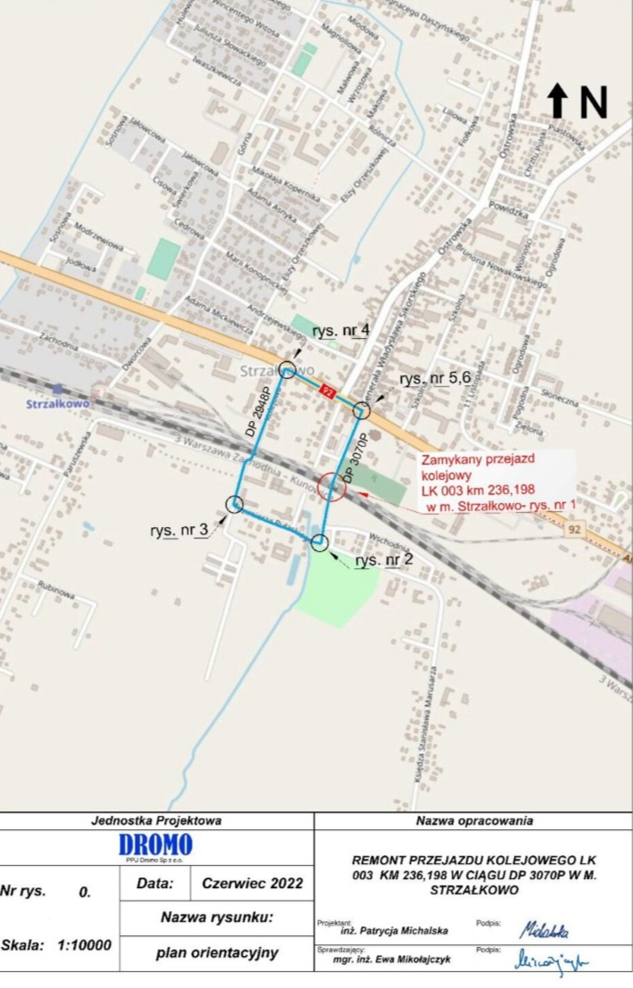 W związku z planowanymi pracami na przejeździe kolejowym – drogowym LK 003 w km 236,198 stacja Strzałkowo na skrzyżowaniu z drogą powiatową 3070P Sokolniki – Strzałkowo w miejscowości Strzałkowo, ul. Marusarza, w terminie od dnia 24 lipca od godz. 21:00 do dnia 25 lipca do godz. 06:00 w/w przejazd zostanie zamknięty. Objazd poprowadzony zostanie zgodnie z załączonym schematem.