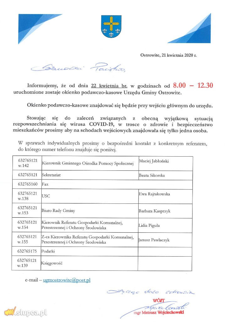 Urząd Gminy Ostrowite, który od kilku tygodni całkowicie był zamknięty dla interesantów, teraz częściowo się otwiera. Przy wejściu zamontowane zostało okienko kasowo-podawcze, przez które mieszkańcy mogą zostawić korespondencję lub dokonać wpłat. Poniżej komunikat wójta w tej sprawie.