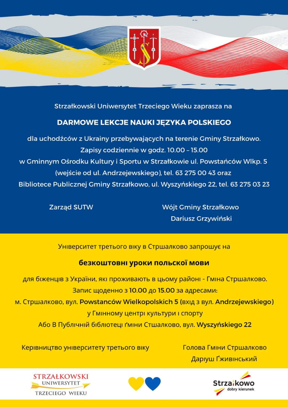 Wójt Gminy Strzałkowo oraz Strzałkowski Uniwersytet Trzeciego Wieku zapraszają na darmowe lekcje nauki języka polskiego dla uchodźców z Ukrainy przebywających na terenie Gminy Strzałkowo.