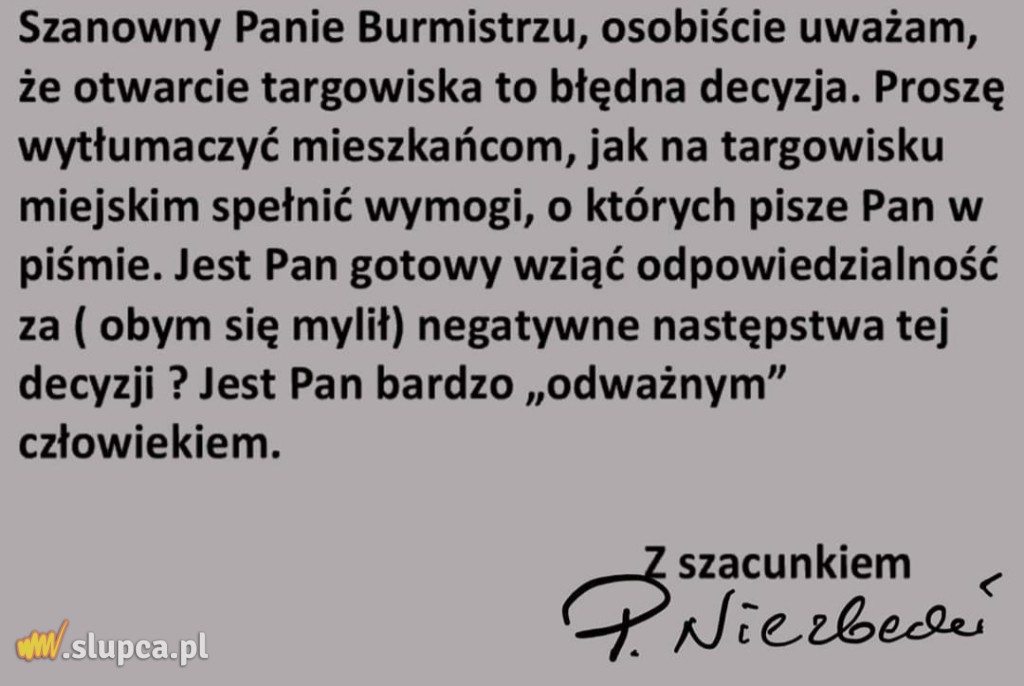 SZANOWNY PANIE NIEZBECKI… Główny Inspektor Sanitarny wydał zalecenia, po spełnieniu których handel obwoźny może mieć miejsce. Wydając takie zalecenia GIS niewątpliwie pozbył się problemu i przerzucił problem na samorządy. Władza na szczeblu rządowym wręcz nawołuje, żeby handlować. Najprostsze co można było zrobić, to na szczeblu rządowym wydać zakaz. No ale władza rodem z PiS nie chcąc być niepopularną przerzuciła problem na innych. W końcu wybory się zbliżają. Podzielił się pan swoim oburzeniem i obawami z osobami odpowiedzialnymi za akcję „Lot do domu”, czyli z premierem Morawieckim? Zapytał pan premiera czy bierze odpowiedzialność za skutki tej akcji? Za brak, dla powracających, kwarantanny innej niż ta w warunkach domowych, którą jakżeż łatwo niektórzy łamią. Czyżby nie słyszał pan o słupczaninie z ul. 11-go listopada w Słupcy? Gości przyjmuje, na dwór wychodzi, a jest objęty kwarantanną. Akcją „Lot do domu” zafundowano nam niebywałe zagrożenie rozprzestrzenienia się koronawirusa tylko po to, żeby ściągnąć ludzi na wybory, a pan czepia się, że będziemy mieli handel na targowisku? Handel, który niejednemu ma zapewnić środki na utrzymanie. No ale co pan może o tym wiedzieć… Syty głodnego nie zrozumie. Mógłby pan wczuć się w sytuację ludzi, którzy żyją od 1-go do 1-go? Jest pan oburzony decyzją Burmistrza o przywróceniu handlu na miejskim targowisku, a czy wykazał pan takie samo oburzenie, kiedy pana koleżeństwo po fachu, już w czasie epidemii, udało się do Włoch i jak wieść po Słupcy niesie, jakby nigdy nic wykazali po powrocie, gotowość do pracy w słupeckim szpitalu? Swoją drogą to ciekawe czy do tej pracy zostali dopuszczeni? A może wystosował pan apel do starosty słupeckiego, kiedy ten ustawił się do zdjęcia na terenie szpitalnym z pączusiami w towarzystwie innych osób? Wcześniej, bodajże 11-go marca br. było jeszcze spotkanie zorganizowane w budynku starostwa, w którym to spotkaniu uczestniczyło co najmniej 60 osób ściśniętych obok siebie niczym śledzie w beczce. Myślę, że nie wystosował pan apelu do władzy powiatowej, bo w końcu to powiatowy koalicjant. Handel na targowisku nie zaszkodzi nam bardziej niż handel w sklepach, gdzie ludzie nie zachowują bezpiecznej odległości, a poproszeni o jej zachowanie patrzą na człowieka jak na ufoludka. Ten handel na targowisku nie zaszkodzi nam bardziej niż zakupy w sklepie z brudnymi koszykami i kasjerkami z niedezynfekowanych rękawicach. Nasz rząd, dopuszczając do sprowadzenia do Polski koronawirusa poprzez niezamknięcie w lutym br. granic kraju ( było już wtedy wiadomo, że koronawirus w Polsce to kwestia dni ) oraz poprzez akcję „Lot do domu”, naraził nas na takie zagrożenie, że decyzja o przywróceniu handlu na słupeckim targowisku jest bez znaczenia, jeśli osoby, które na to targowisko przyjdą dostosują się do zasad bezpieczeństwa. Handel na targowisku nie będzie bardziej niebezpieczny niż handel w sklepie, w którym nie przestrzega się zasad bezpieczeństwa na okoliczność koronawirusa. Koronawirus prędzej czy później w Słupcy się pojawi. Nie dlatego, że Burmistrz przywrócił handel na targowisku, ale dlatego, że kiedy należało myśleć o zamknięciu granic, to nasz rząd miał inne priorytety niż nasze bezpieczeństwo i zajmował się przyznaniem 10 mld na TVP na najbliższe 5 lat. Handel na targowisku nie będzie bardziej niebezpieczny niż doktorek – narciarz przechadzający się bez maski po Lidlu czy innym słupeckim sklepie.