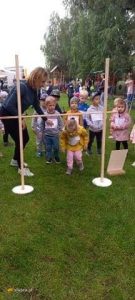 Tego dnia wszystkie dzieci i ich wychowawcy przyszli do przedszkola w strojach sportowych. Głównym celem było zachęcenie dzieci do aktywności ruchowej na świeżym powietrzu ,ale też integrowanie się grup przedszkolnych, kształtowanie zachowań prozdrowotnych, nabywanie wiary we własne siły i możliwości oraz wzbogacanie przeżyć poprzez szlachetne współzawodnictwo. Konkurencje sportowe odbywały się we wszystkich grupach wiekowych. Na początku, jak na prawdziwych sportowców przystało, przedszkolaki złożyły uroczyste przyrzeczenie, że będą wszystkie zadania wykonywały według sportowych zasad i bawić się zgodnie ze sobą. Zawody rozgrywano na tzw. 6 stacjach, przez które przechodziły dzieci w swoich grupach. Przedszkolaki próbowały swoich sił m.in. w przechodzeniu pod obniżającą się poprzeczką, skakały w workach do wyznaczonego miejsca, jeździły slalomem pomiędzy pachołkami, chodziły z woreczkiem na głowie, rzucały piłki do celu. Każde prawidłowo wykonane ćwiczenie budziło w dzieciach ogromną radość i zadowolenie z dobrze wykonanego zadania. Wszystkie przedszkolaki, oprócz wspaniałych sportowych emocji i niezapomnianych wrażeń, wraz z gratulacjami za postawę fair play, otrzymały z rąk Dyrektor Barbary Wojtkowiak nagrody.Zwieńczeniem imprezy było pamiątkowe zdjęcie. Dzieci obiecały sobie, że właśnie tak będą spędzać wolny czas – na zabawach ruchowych wspólnie z rodzicami.