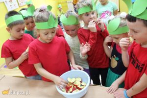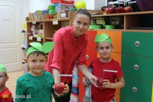 Na dzieci czekało wiele niespodzianek. Najpierw odbyła się pogadanka na temat zdrowotnych walorów jabłek. Przedszkolaki opisywały jabłko, jako wygląd, zapach i smak. Wysłuchały opowiadania „O jabłuszku i Krasnym Ludku”.