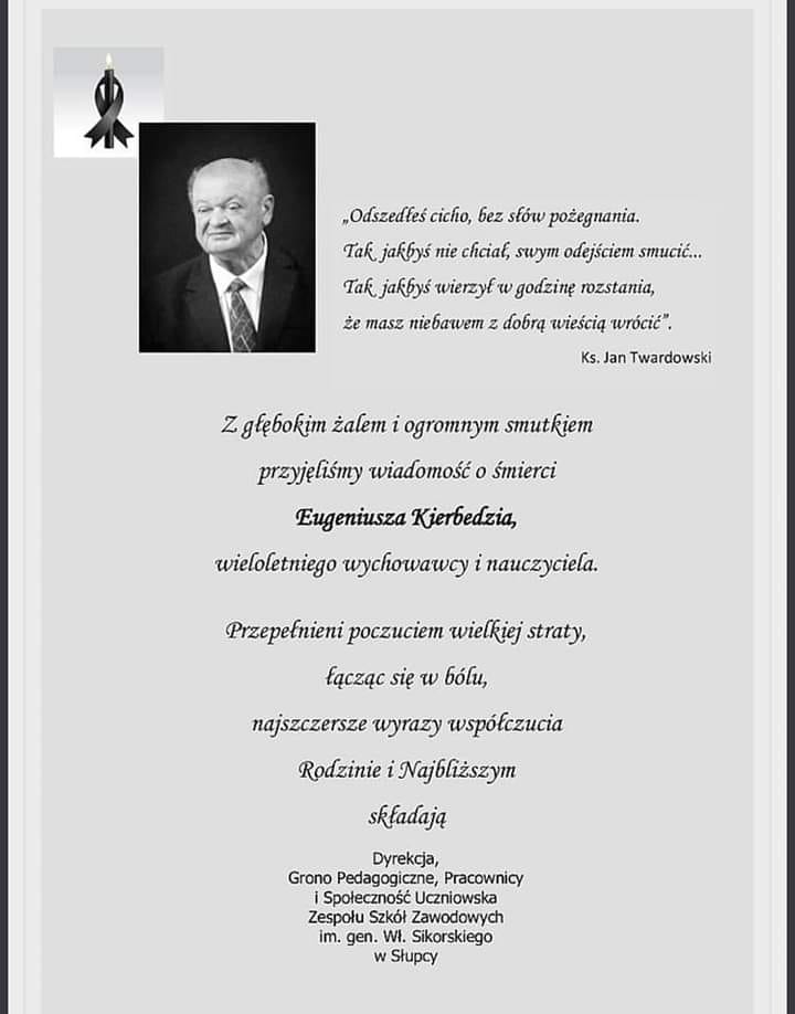 Nie żyje Eugeniusz Kierbedź, wieloletni nauczyciel Zespołu Szkół Zawodowych w Słupcy. Zmarł wczoraj wieczorem, w wieku 68 lat. Informację o śmierci pedagoga podała dziś szkoła, z którą przez lata był związany. O terminie pogrzebu poinformujemy podamy wkrótce.
