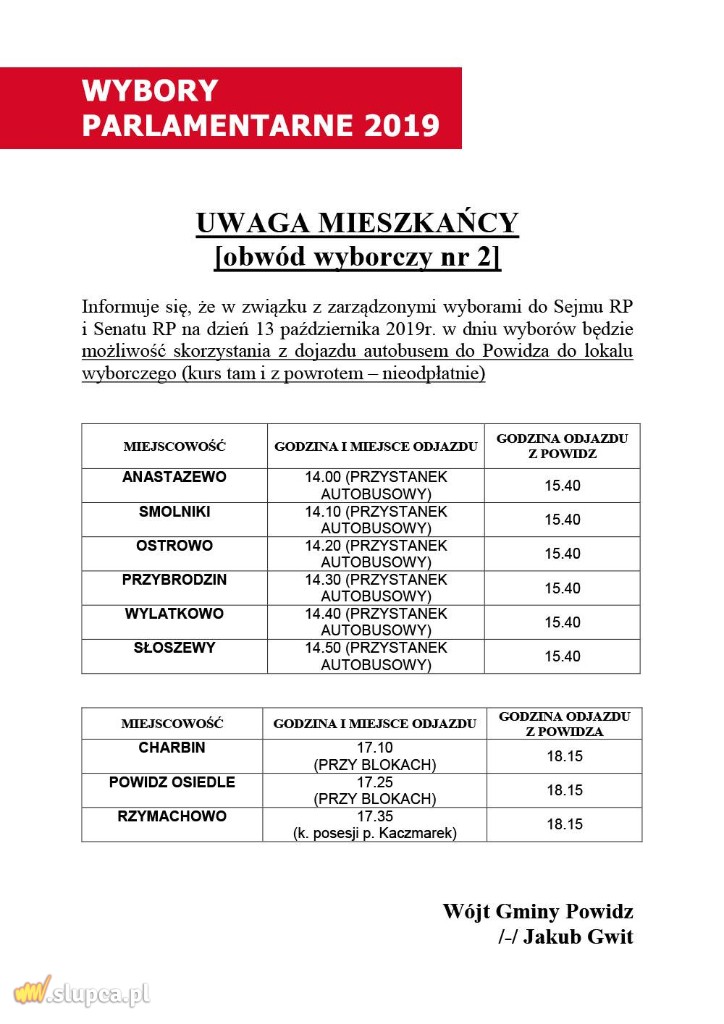Władze gminy Powidz, która zawsze wyróżnia się wysoką frekwencją w wyborach, również teraz chcą, by jak najwięcej mieszkańców oddało swój głos.-Wszystko zależy od nas, dlatego w najbliższą niedzielę udajemy się do lokali wyborczych. Aby w tym pomóc, uruchomiony zostaje specjalny autobus dla wyborców z miejscowości sołeckich, który zawiezie do lokalu wyborczego nr 2 przy ul. Strzałkowskiej w Powidzu (remiza OSP) i z powrotem – czytamy na facebooku gminy.