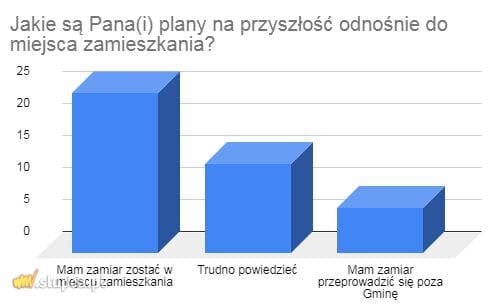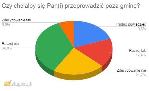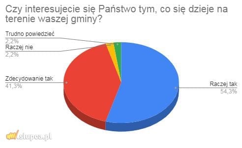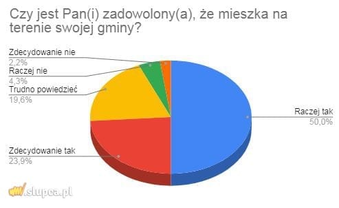 Wśród badanych, którzy odpowiedzieli na pytanie Czy jest Pan(i) zadowolony(a), że mieszka na terenie swojej gminy?, dokładnie połowa stwierdziła, że raczej tak. 23,9% ankietowanych odpowiedziało, że zdecydowanie tak. Z kolei aż 19,6%, że „trudno powiedzieć”.
