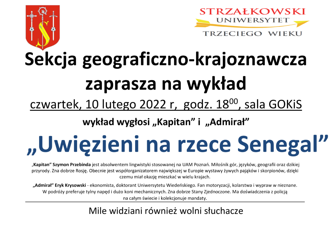 W czwartek 10 lutego o godz. 18.00 w Gminny Ośrodku Kultury i Sportu w Strzałkowie odbędzie się kolejny wykład sekcji krajoznawczo – geograficznej Strzałkowskiego Uniwersytetu Trzeciego Wieku. „Kapitan” Szymon Przebinda oraz „Admirał” Eryk Krysowski podzielą się wrażeniami z wyprawy do Afryki i wodnej przygody na rzece Senegal. Temat wykładu: „Uwięzieni na rzece Senegal”. – Zapraszamy na dużą dawkę dobrego humoru i wiele ciekawych informacji z przeżytej wyprawy – zachęcają organizatorzy wykładu.