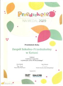 W środę 18 grudnia w Poznaniu odbyło się podsumowanie plebiscytu Głosu Wielkopolskiego. Podczas uroczystej gali w eleganckich wnętrzach Pałacu Działyńskich nagrodzono zwycięzców wielkiej akcji poświęconej przedszkolom. Rodzice maluchów głosując w plebiscycie, wskazali najlepsze placówki przedszkolne, które teraz mogą cieszyć się zaszczytnymi tytułami. Wśród wyróżnionych znalazł się Zespół Szkolno – Przedszkolny w Kotuni, który zdobył I miejsce w powiecie słupeckim. Dyrektor Jolanta Kamińska odebrała pamiątkową tablicę „Przedszkole na medal”, dyplom oraz voucher o wartości 3000 zł do wykorzystania na kampanię reklamową w Głosie Wielkopolskim oraz serwisie naszemiast.pl .