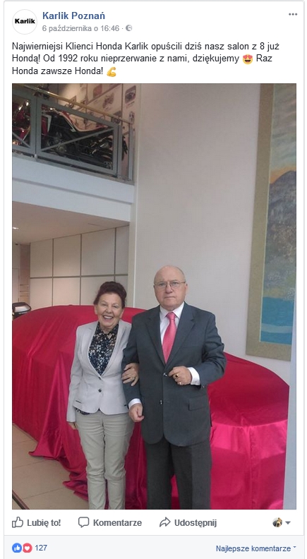 Janusz Bis, lekarz rodzinny z Ostrowitego wraz z żoną – panią Barbarą to miłośnicy Hondy. Auto tej marki kupili już po raz… ósmy. Co ciekawe, za każdym razem w tym samym salonie – poznańskim Karliku. Na swojej facebookowej stronie Karlik zamieścił wpis na ten temat podkreślając, że Państwo Bisowie to ich najwierniejsi klienci. Korzystają z ich usług nieprzerwanie od 1992 roku. Tacy klienci to prawdziwy skarb!