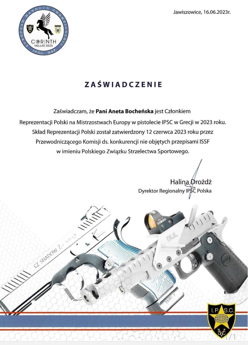 Aneta Bocheńska z Powidza będzie reprezentować Polskę na Mistrzostwach Europy w pistolecie IPSC w Grecji – Ogromnie się cieszę, że będę mogla reprezentować nasz kraj – pisze w mediach społecznościowych.