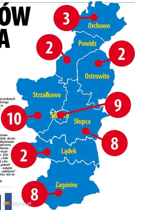 Dla porównania, za rok 2019 w powiecie słupeckim liczba „milionerów” wynosiła 42 osoby, za rok 2018 – 37, w 2017 r. było ich 28, a w 2016 r. i 2015 r. „zaledwie” 18. Osoba z największymi zarobkami w roku 2020 uzyskała niecałe 6 mln zł dochodu. Z informacji uzyskanych z Urzędu Skarbowego w Słupcy wynika, że reprezentuje ona branżę produkcyjną. W roku 2019 był to dochód rzędu ponad 6 mln i dotyczył osoby z branży menadżerskiej.