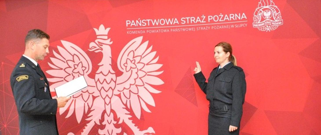 W miniony czwartek w siedzibie Komendy Powiatowej PSP w Słupcy odbyło się uroczyste ślubowanie, które złożyła str. Justyna Nowaczyk przyjęta do służby przygotowawczej w Państwowej Straży Pożarnej. Ślubowanie przyjął Komendant Powiatowy PSP w Słupcy bryg. Zbigniew Rzemyszkiewicz. Nowa funkcjonariuszka w słupeckiej komendzie zajmować się będzie sprawami księgowymi.