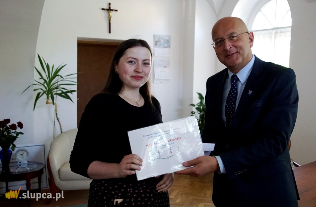 Laureatki konkursu na projekt graficzny maseczki ochronnej z wykorzystaniem logo promocyjnego powiatu słupeckiego z rąk starosty odebrały dziś nagrody. Wygrał projekt Mariki Zaradzkiej z Cienina Kolonii. Nagrodę odebrała jej siostra Andżelika. Na spotkanie w gabinecie starosty przybyła także Natalia Deręgowska z Zagórowa, która zdobyła miejsce trzecie. Najmłodsza uczestniczka konkursu Weronika Kwiatkowska ze Słupcy nagrodę odbierze w innym terminie.