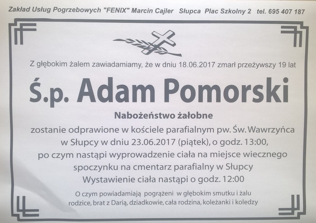 W piątek, 23 czerwca odbędzie się pogrzeb Adama Pomorskiego, 19-letniego słupczanina, który w minioną niedzielę zginął w wypadku w Węgierkach. Msza św. w jego intencji odprawiona zostanie o godz. 13.00 w kościele pw. św. Wawrzyńca, po czym nastąpi wyprowadzenie na słupeckim cmentarz.