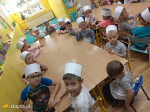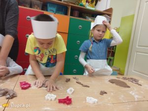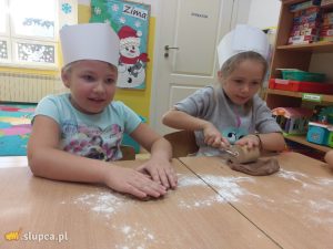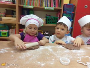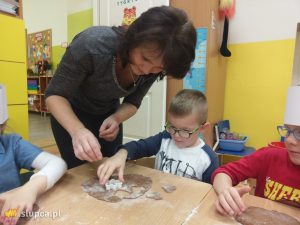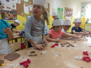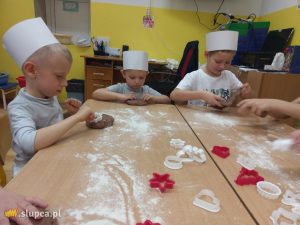 Z pomocą pań praca z przygotowaniem wypieków szła sprawnie i bez trudu. Przedszkolaki wygniatały i wałkowały ciasto według przygotowanego wcześniej przepisu. Wszystkim podobało się wykrawanie świątecznych kształtów – choinek, bałwanków, aniołków, mikołajów przy pomocy foremek.