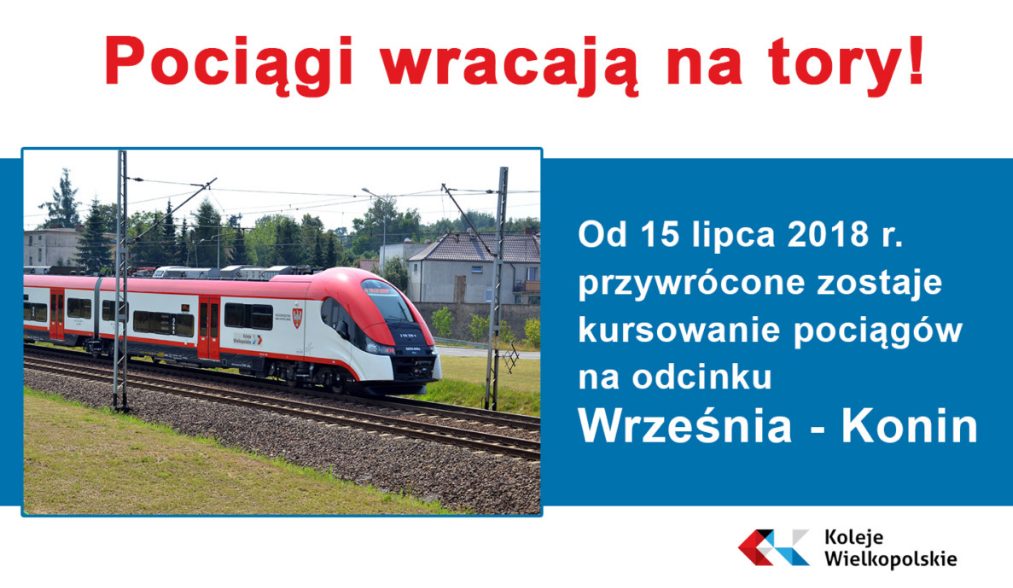 15 lipca br. rozpoczyna się kolejny etap projektu przygotowanego przez PKP Polskie Linie Kolejowe S.A. dotyczący modernizacji linii kolejowej na odcinku Warszawa. – Po roku funkcjonowania zastępczej komunikacji autobusowej pociągi wracają na tory pomiędzy Wrześnią a Koninem, a wyłączony z ruchu zostanie kolejny odcinek linii: Konin – Kutno. Przerwa w ruchu pociągów pomiędzy Koninem a Kutnem potrwa od 15 lipca 2018 r. do czerwca 2019 r. – na swojej stronie informują Koleje Wielkopolskie.