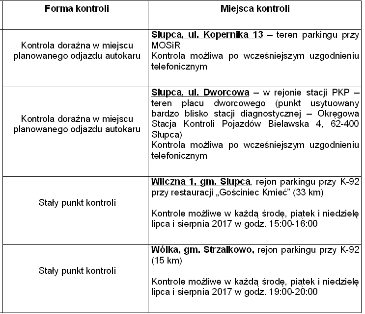 W celu umożliwienia łatwiejszego kontaktowania się z policją w sytuacjach, kiedy jest to niezbędne, w czasie wakacji słupecka policja utworzyła stałe punkty kontroli autokarów przewożących osoby na wypoczynek. Osoby zainteresowane (organizatorzy, opiekunowie, rodzice, uczestnicy wycieczek) mogą kontaktować się w sprawie kontroli autobusów osobiście w jednostce policji, składając pisemny wniosek lub telefonicznie. Prosimy o zgłoszenia z kilkudniowym wyprzedzeniem, gdyż termin i czas kontroli musimy skorelować z pełnioną przez policjantów służbą.