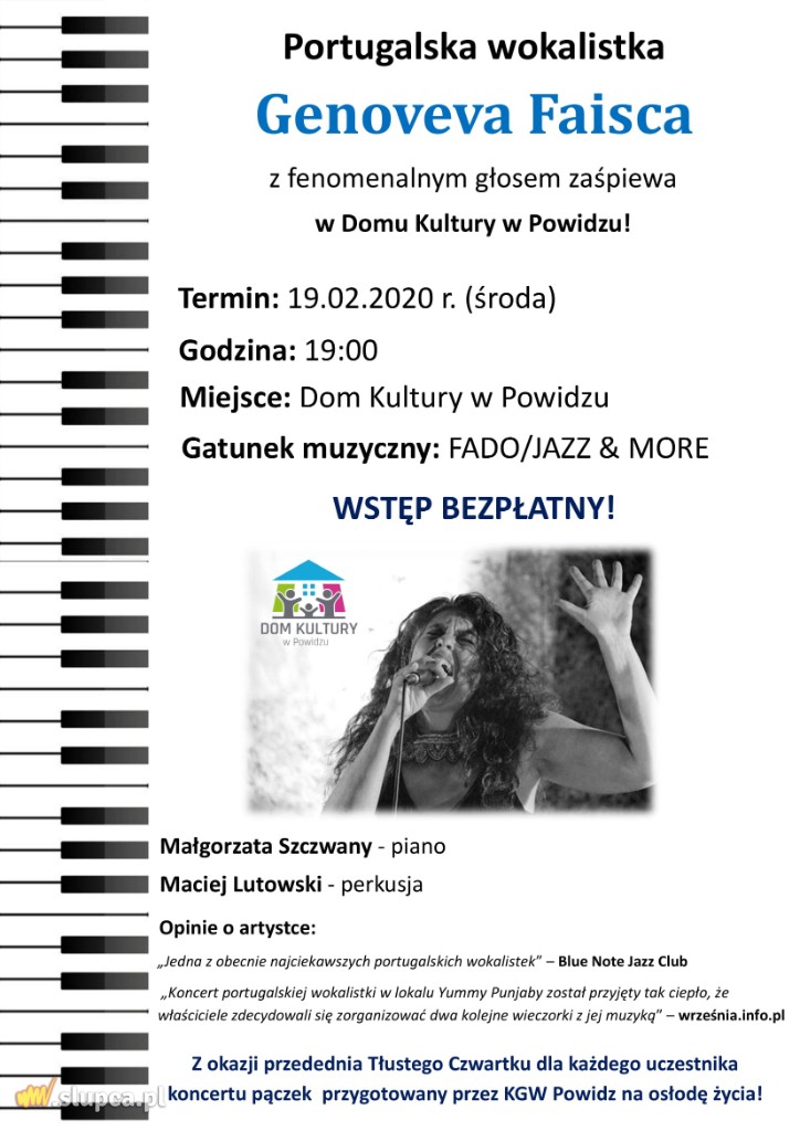 W Domu Kultury w Powidzu, 19 lutego o godz. 19.00 odbędzie się koncert portugalskiej wokalistki Genovevy Faisca. Tego dnia, w przeddzień Tłustego Czwartku każdy widz otrzyma pączka usmażonego przez zwyciężczynie konkursu „Nasze Kulinarne Dziedzictwo – Smaki Regionów”, czyli Koło Gospodyń Wiejskich z Powidza.