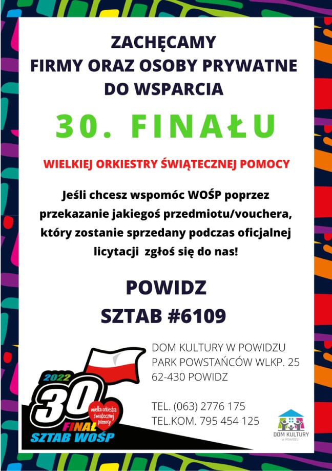 Wielka Orkiestra Świątecznej Pomocy z Jurkiem Owsiakiem na czele już od lat niesie pomoc najbardziej potrzebującym, wymagającym specjalistycznej opieki zdrowotnej. Pierwsza edycja akcji odbyła się już niemal trzy dekady temu – w 1992 r. Finały WOŚP każdego roku są wydarzeniem na wielką skalę i cieszą się ogromnym zainteresowaniem wśród Polaków, którzy nie tylko mogą pomóc innym, ale i świetnie się przy tym bawić. W tym roku w ostatnią niedzielę stycznia odbędzie się 30. Jubileuszowy Finał WOŚP pod hasłem „Przejrzyj na oczy”. Wolontariusze do puszek będą zbierać pieniądze na rzecz okulistyki dziecięcej. W związku z tym Dom Kultury w Powidzu rozpoczyna wielką zbiórkę fantów na licytację. – Można przekazać rzeczy, przedmioty, gadżety i vouchery, które zasilą puszkę Sztabu #6109 Powidz. Wszystkie fanty i przedmioty na licytację można przynosić do 23 stycznia 2022 r. do Domu Kultury w Powidzu. Więcej informacji pod nr tel. 795 454 125.