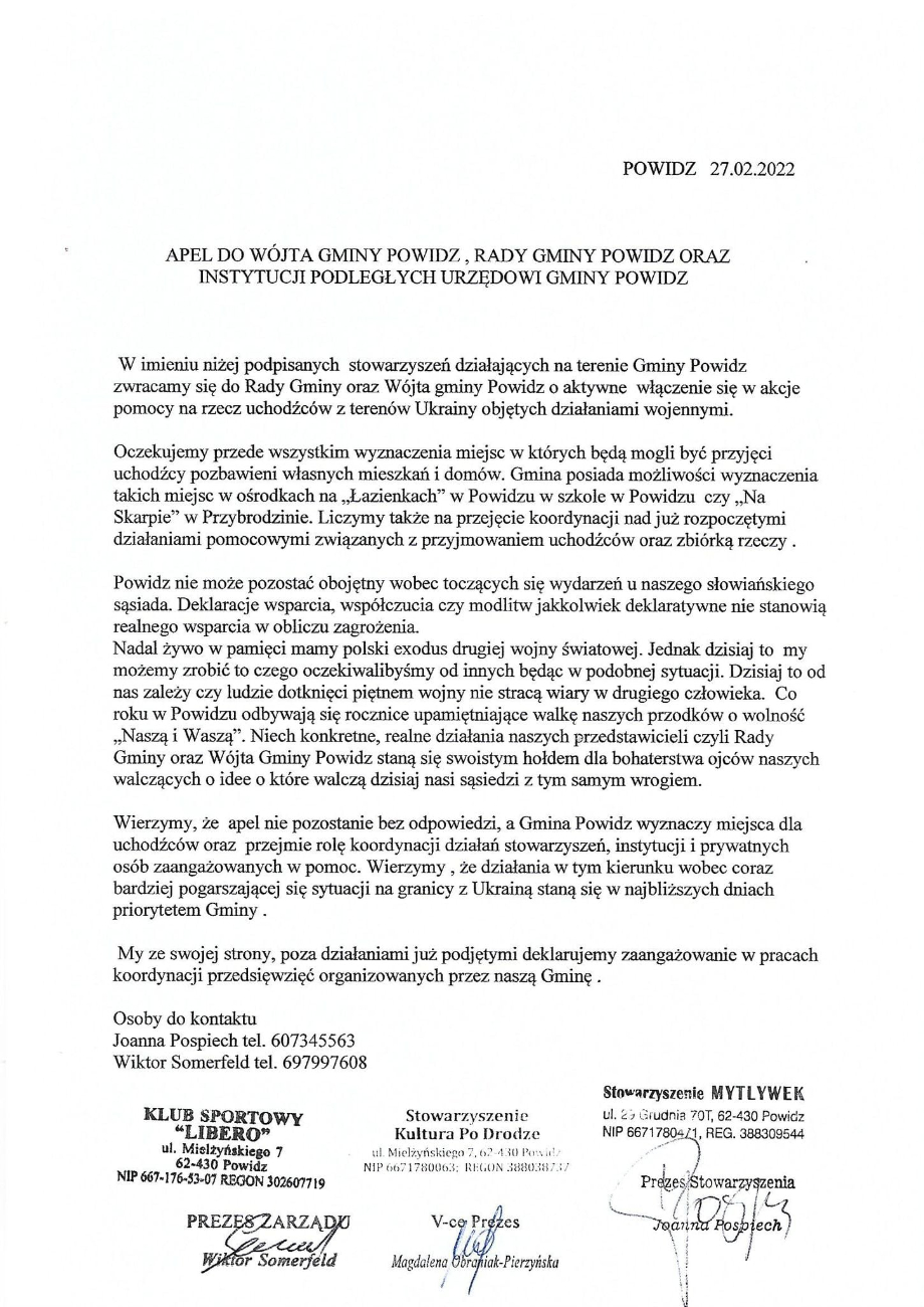 W związku z narastającym kryzysem humanitarnym na Ukrainie zarządy stowarzyszeń działających na terenie Gminy Powidz reprezentujące osoby już zaangażowane w pomoc postanowiły wystosować apel do Rady Gminy oraz Wójta Gminy Powidz. Apel został złożony w formie pisemnej do Urzędu Gminy. Treść poniżej.