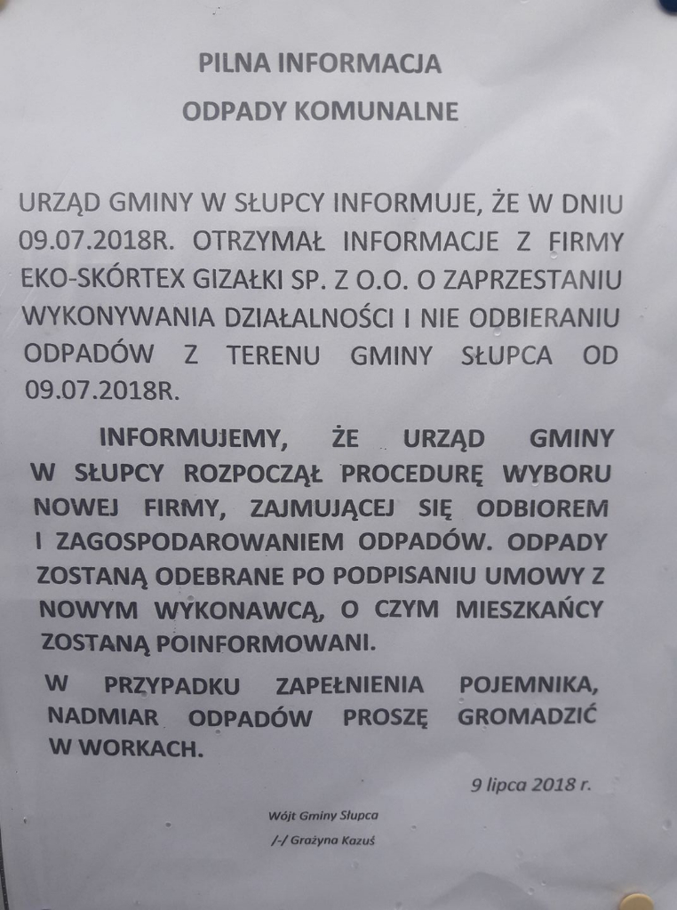 Kolejny argument,że funkcja wójta jest w Słupcy niepotrzebna,zresztą to oczywiste!!!Teraz z nożem na gardle podpiszą kolejną umowę skrajnie niekorzystną dla mieszkańców gminy bo w takiej sytuacji jaką gmina sobie zafundowala to firma będzie dyktować warunki…A mieszkańcy zapłacą jeszcze wyższy rachunek chociaż już dziś jest absurdalnie drogo!!!! W ogóle jak to możliwe ze gmina podpisuje umowę dającą firmie możliwość wypowiedzenia jej z dnia na dzień???a mieszkańcy mają sobie tworzyć prywatne wysypiska śmieci na swoich posesjach????żenada żenada żenada