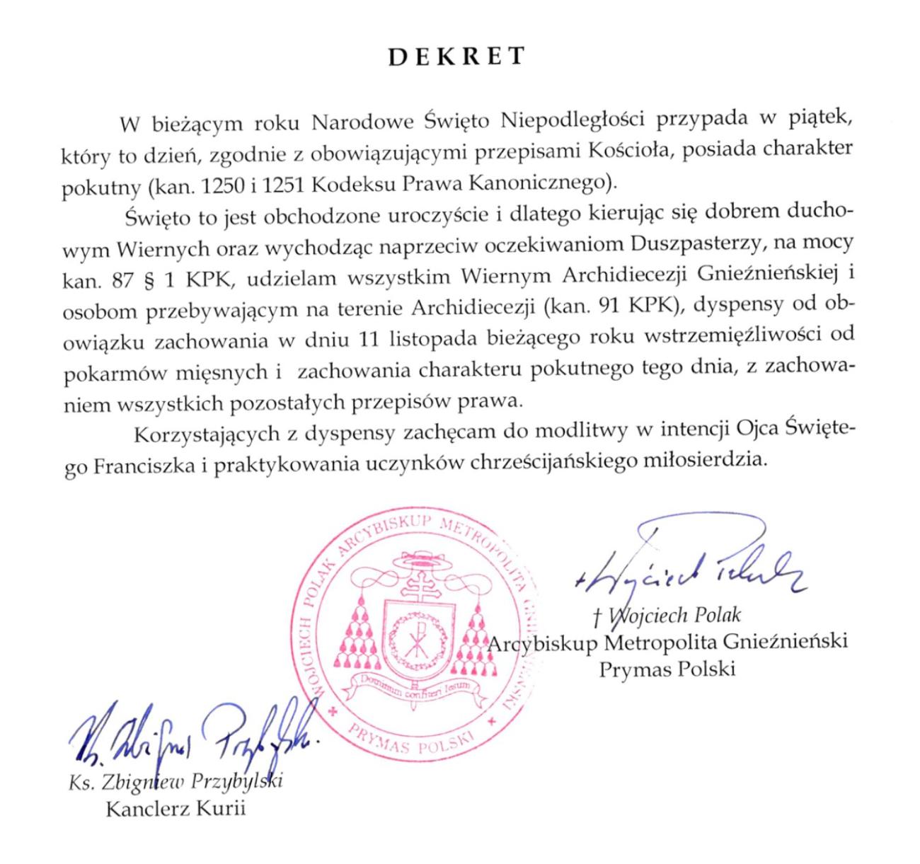 W piątki nie jesz mięsa? W najbliższy, 11 listopada post nie będzie obowiązywać. Na ten dzień arcybiskup gnieźnieński Wojciech Polak udzielił wiernym z archidiecezji gnieźnieńskiej oraz wszystkim przebywającym na terenie archidiecezji gnieźnieńskiej dyspensy od obowiązku zachowania wstrzemięźliwości od pokarmów mięsnych i zachowania pokutnego charakteru tego dnia. Publikujemy dekret Prymasa Polski.