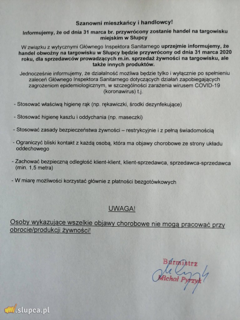 Bardzo dobra decyzja P. Burmistrza . W końcu klarowne wytyczne Głównego Inspektora Sanitarnego, który wreszcie zauważył że to działalność targowisk i ryneczkow odciąży zatłoczone Biedronki , Lidle, itp. sklepy . W Poznaniu przez ani jeden dzień targowiska nie byly zamknięte i to dzięki determinacji Władz Miasta, bo nacisk był spory.
