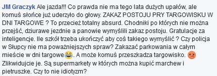 – Ale jazda!!! Co prawda nie ma tego lata dużych upałów, ale komuś słońce już uderzyło do głowy. ZAKAZ POSTOJU PRZY TARGOWISKU W DNI TARGOWE ? To przecież totalny absurd. Chodniki po których nie można przejść, dziurawe jezdnie a panowie wymyślili zakaz postoju. Gratulacje za inteligencje. Ile szkół trzeba ukończyć aby coś takiego wymyślić ? Czy policja w Słupcy nie ma poważniejszych spraw? Zakazać parkowania w całym mieście w dni targowe