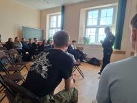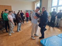 Specjalne zajęcia dla uczniów prowadził podkom. Dariusz Nowicki, instruktor taktyk i technik interwencji. Przywołując konkretne przykłady z życia wskazywał właściwe zachowania wobec różnych zagrożeń. Nie zabrakło tematów związanych z zagrożeniami terrorystycznymi i właściwej reakcji na zastaną sytuację. Na zakończenie spotkania uczniowie wzięli udział z warsztatach z samoobrony.