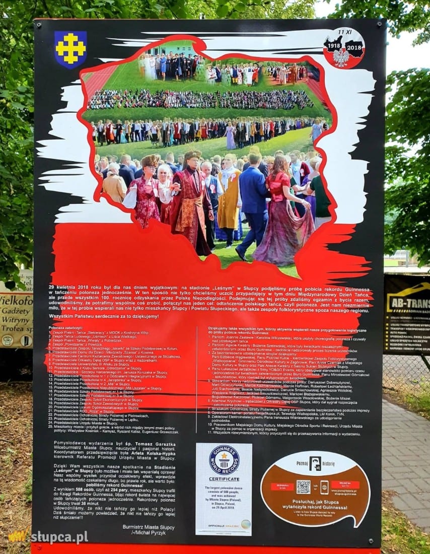 Wczoraj przed wejściem na Stadion Leśny przy ul. Gajowej została zamontowana tablica pamiątkowa z podjętej w 2018 r. i zakończonej sukcesem próby pobicia rekordu Guinnessa w ilości par tańczących poloneza jednocześnie. – W wydarzeniu wzięły wówczas udział 294 pary w strojach z epoki. Powstaje również związane z tym wydarzeniem minisłuchowisko, które będzie dostępne do odsłuchiwania w sierpniu br. – informują miejscy urzędnicy.