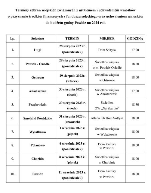W przyszłym tygodniu rozpoczną się zebrania sołeckie w gminie Powidz. Podczas zebrań uchwalane będą wnioski o przyznanie środków finansowych z funduszu sołeckiego oraz wnioski do budżetu gminy na przyszły rok. – Prawo głosowania podczas zebrań mają osoby zameldowane na stałe na terenie Gminy Powidz lub wpisane do rejestru wyborców Gminy Powidz – przypominają urzędnicy. Poniżej harmonogram zebrań.