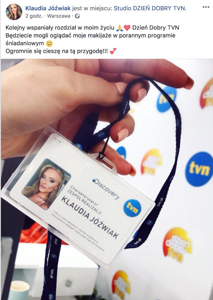 Pochodząca ze Słupcy Klaudia Jóźwiak dołączyła do ekipy Dzień Dobry TVN. – Będziecie mogli oglądać moje makijaże w porannym programie śniadaniowym – poinformowała dzisiaj na facebooku. Gratulujemy!