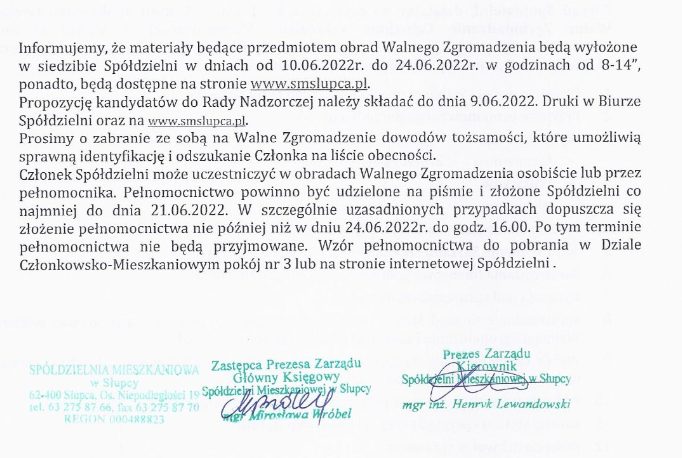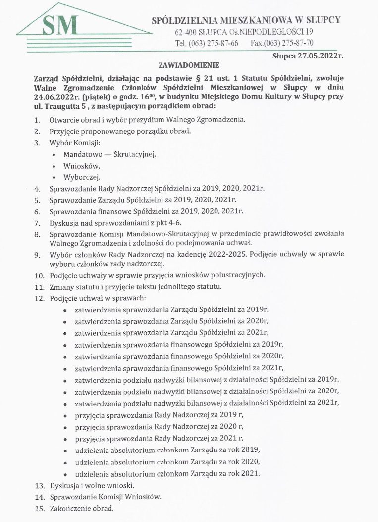 Członkowie Spółdzielni Mieszkaniowej w Słupcy wkrótce wybiorą nowe władze. Nową radę nadzorczą poznamy po walnym zebraniu, które zaplanowano na 24 czerwca. Poniżej porządek obrad.