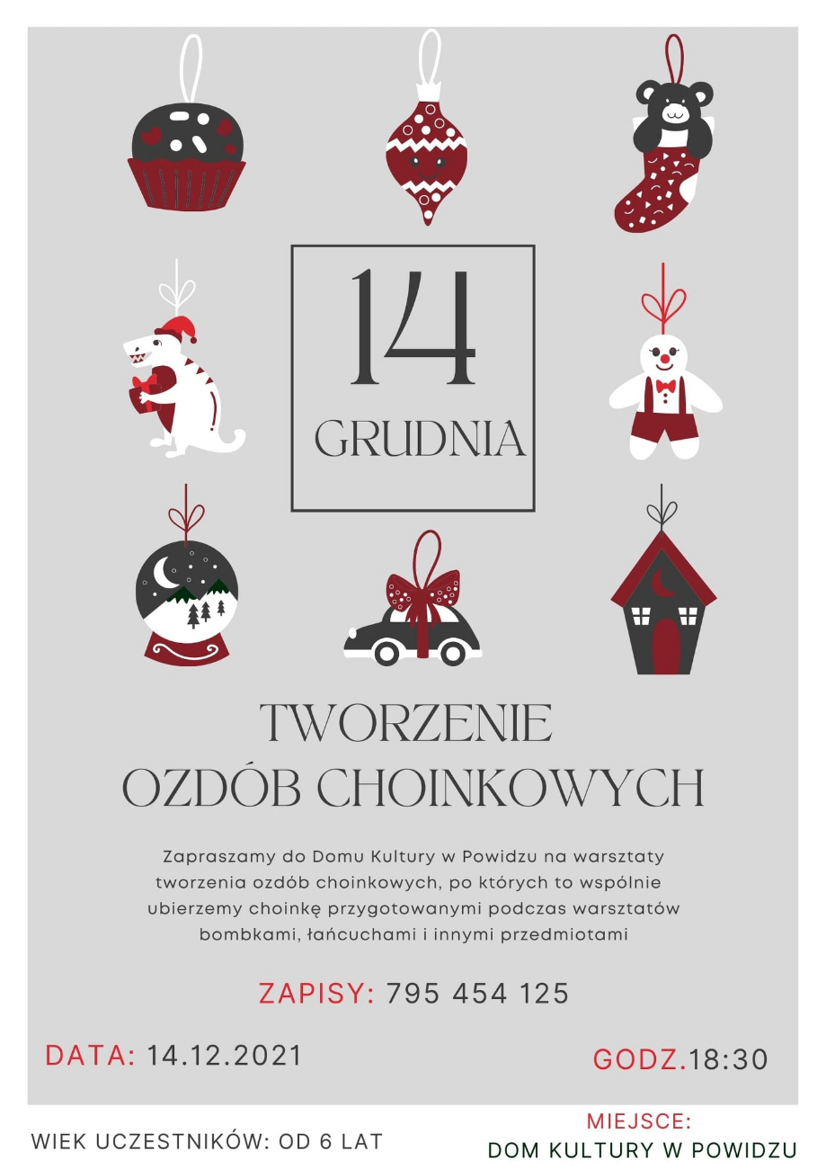 Już 14 grudnia (wtorek) o godz. 18:30 w Domu Kultury w Powidzu odbędą się warsztaty tworzenia ozdób choinkowych, po których uczestnicy wspólnie ubiorą choinkę przygotowanymi podczas zajęć bombkami, łańcuchami i innymi przedmiotami. – Stworzymy makaronowe łańcuchy, bombki z masy solnej i nie tylko! Zapraszamy serdecznie dzieci i młodzież od 6 roku życia – zachęcają pracownicy powidzkiego Domu Kultury. Zapisy pod nr tel.: 795 454 125. Z racji obostrzeń liczba miejsc ograniczona.