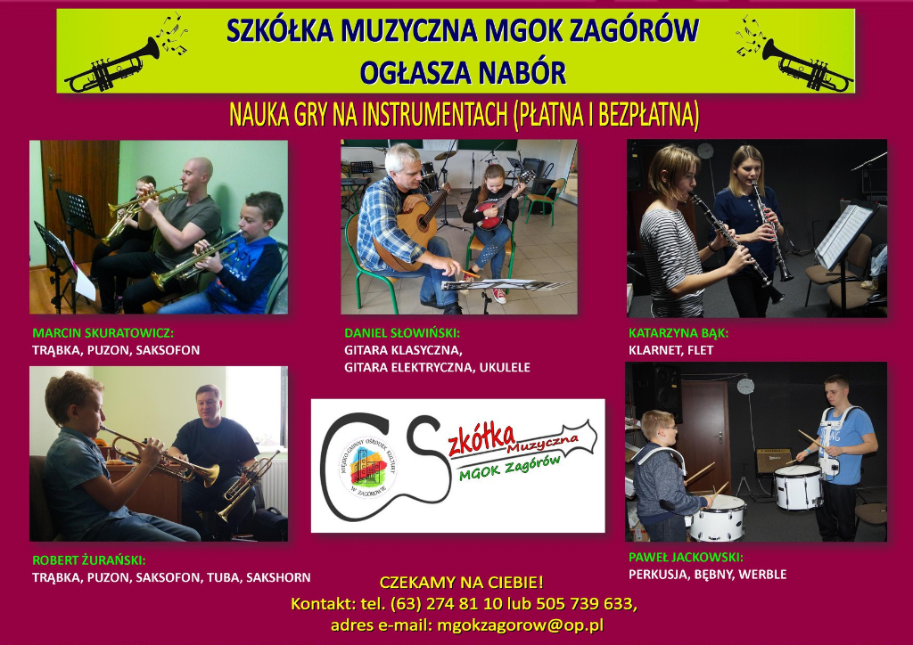 Znacie młodych bądź starszych, którzy chcą uczyć się gry na instrumentach i być może w przyszłości zasilić szeregi Orkiestry Reprezentacyjnej Miasta Zagórów? Jeśli tak, prosimy o kontakt. Udzielimy szczegółowych informacji. Szkółka Muzyczna MGOK Zagórów ogłasza nabór! Rozwijajmy muzyczne pasje!