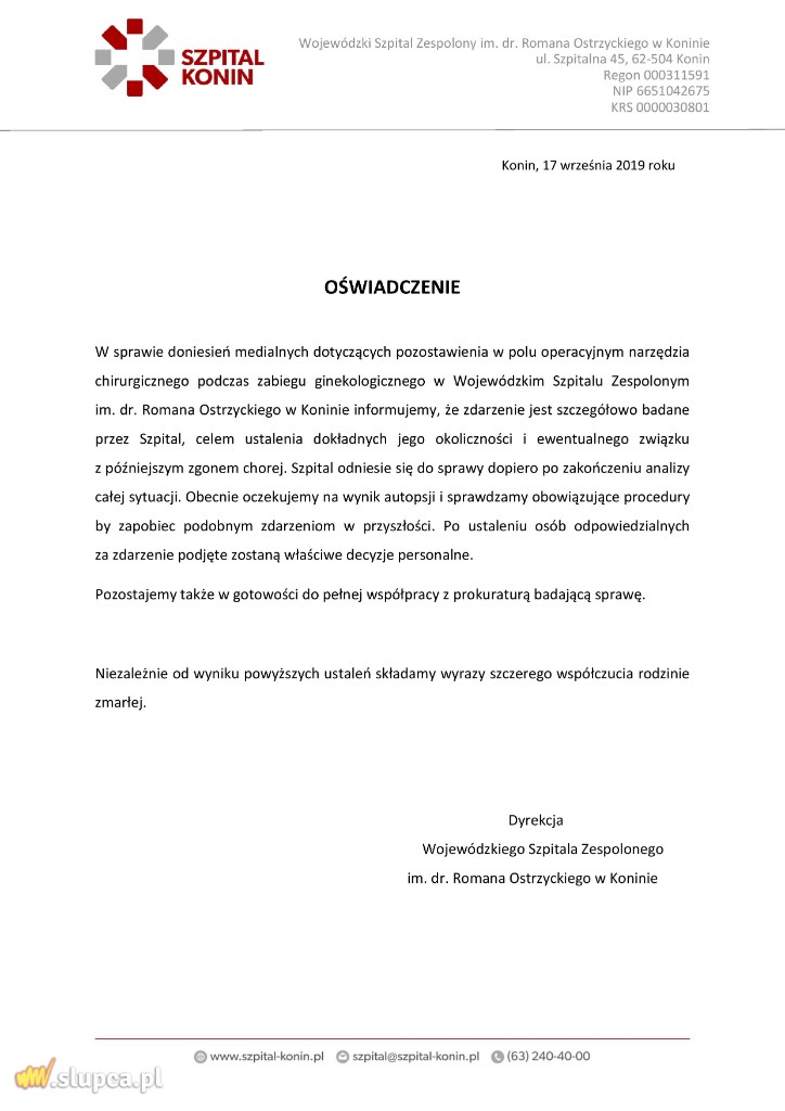Władze konińskiego szpitala na swojej stronie internetowej opublikowały dziś oświadczenie dotyczące tragedii, o której wczoraj informowaliśmy. Przypomnijmy, że po operacji lekarze zaszyli w ciele 33-letniej mieszkanki naszego powiatu duże narzędzie chirurgiczne. Kilka dni po operacji polegającej na jego wyciągnięciu pacjentka zmarła.