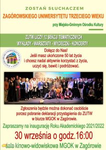 Zgłoszenia można dokonać osobiście poprzez pobranie deklaracji przystąpienia do ZUTW w biurze MGOK w Zagórowie. Przy okazji chcemy wszystkich Państwa – zarówno obecnych, jak i przyszłych słuchaczy ZUTW – zaprosić na inaugurację Roku Akademickiego 2021/2022, która odbędzie się 30 września o godz.16:00 w sali kinowo-widowiskowej MGOK – zaprasza MGOK w Zagórowie.