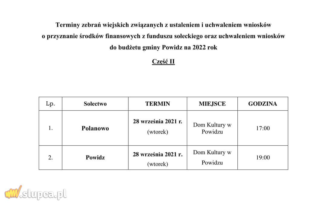 Poznaliśmy terminy zebrań wiejskich w Polanowie i Powidzu związanych z ustaleniem i uchwaleniem wniosków o przyznanie środków finansowych z funduszu sołeckiego oraz uchwaleniem wniosków do budżetu gminy Powidz na 2022 rok.