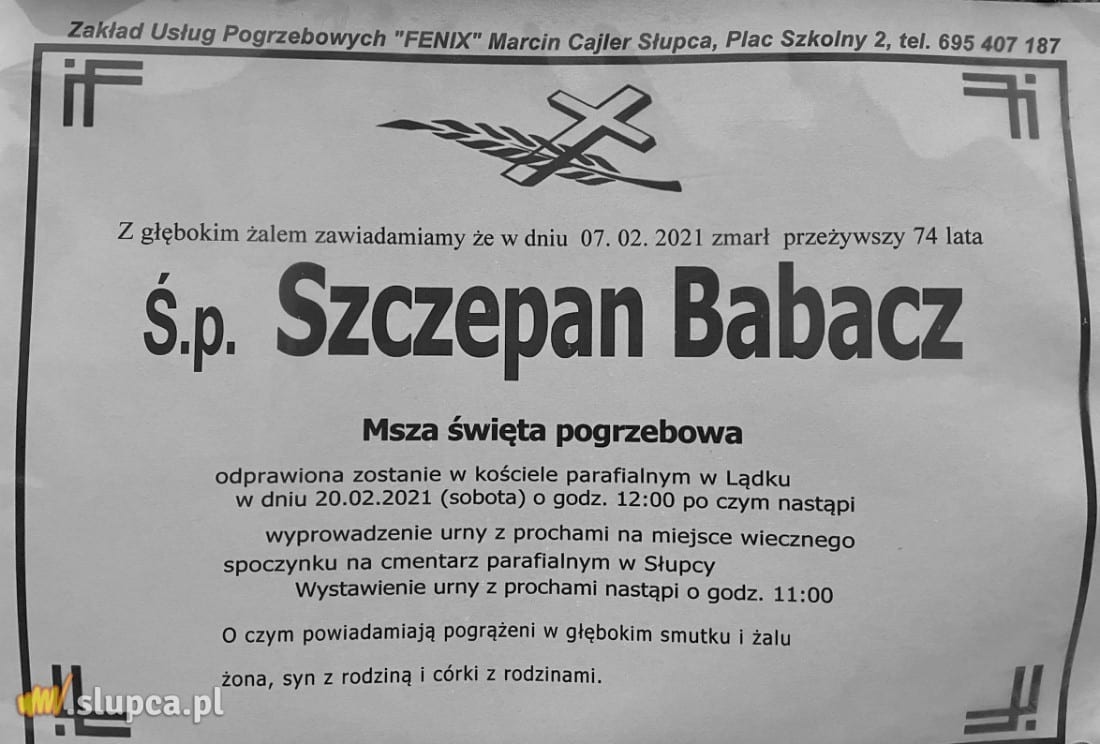 W najbliższą sobotę odbędzie się pogrzeb Szczepana Babacza, wieloletniego prezesa gminnego OSP w Lądku, pierwszego sekretarza powiatu słupeckiego, prezesa lądkowskiego GSu. Msza św. w intencji Zmarłego odbędzie się o godz. 12.00 w Lądku, następnie urna z prochami zostanie złożona na cmentarzu w Słupcy.