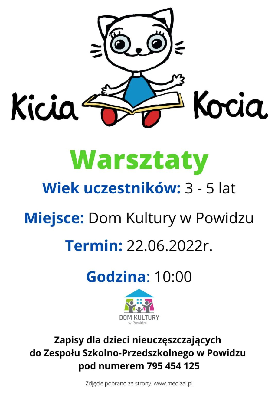 Już jutro w powidzkim Domu Kultury odbędą się warsztaty Kici Koci, na które zaproszono 3 i 5 latki z Zespołu Szkolno-Przedszkolnego w Powidzu. – Wiemy jednak, że nie każde dziecko uczęszcza do naszej placówki szkolno – przedszkolnej, dlatego też jeśli jest ktoś chciałby przyjść uczestniczyć w w/w warsztatach prosimy o kontakt pod nr tel. 795 454 125 – piszą pracownicy powidzkiego Domu Kultury.