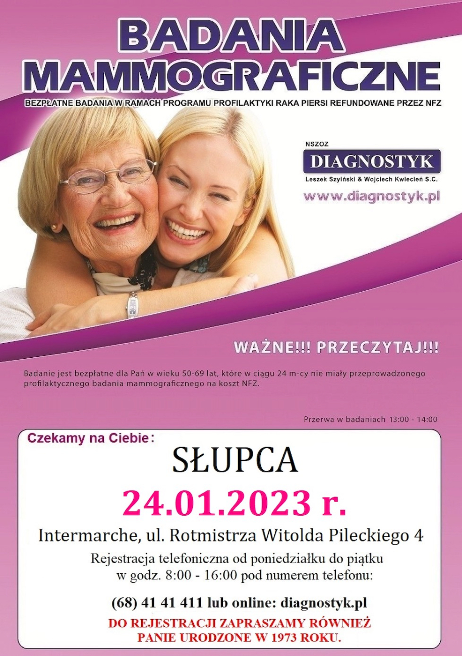 Jutro (24 stycznia) przy sklepie Intermarche w Słupcy przy ul. Pileckiego 4 przeprowadzana będą bezpłatne badania mammograficzne dla kobiet w wieku od 50 do 69 lat, które w ciągu ostatnich dwóch lat nie miały wykonywanych tego typu badań. Zapisy na badania prowadzone są pod numerem telefonu: 68 41 41 411 (od 8.00 do 16.00: pn.-pt. )