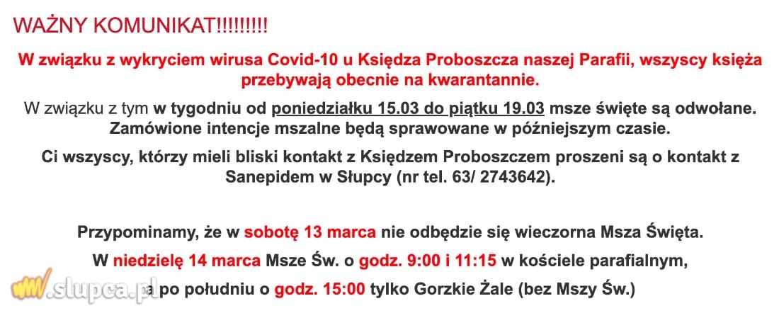 Wszyscy księża zagórowskiej parafii są na kwarantannie. To skutek wykrycia koronawirusa u proboszcza. Na stronie parafii pojawił się komunikat w tej sprawie.