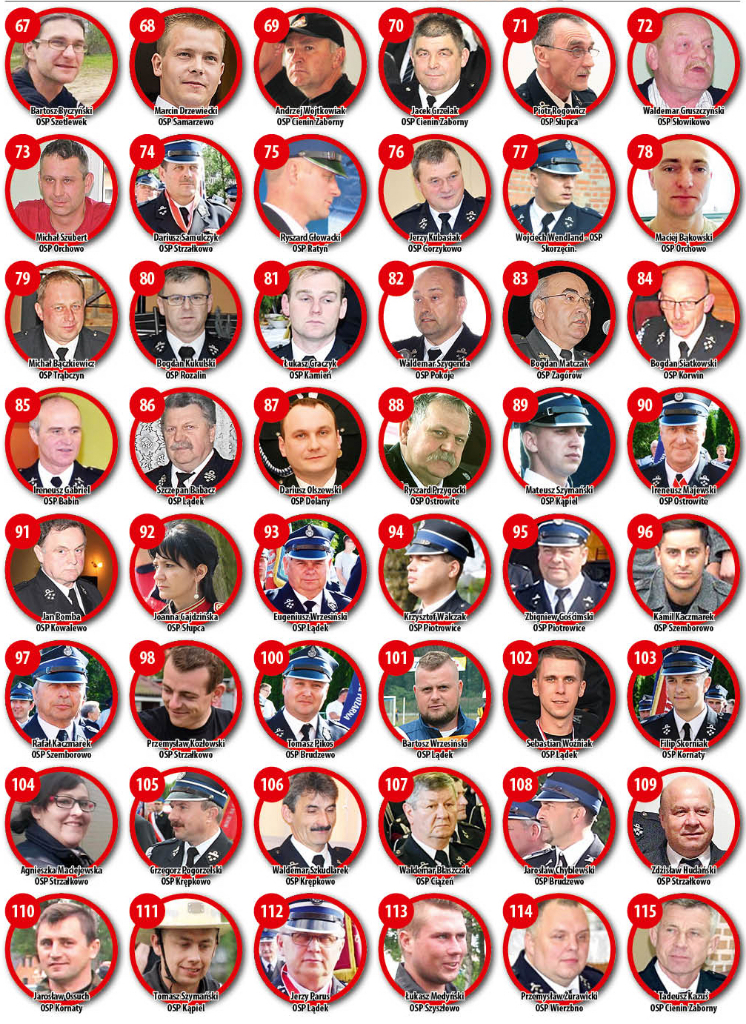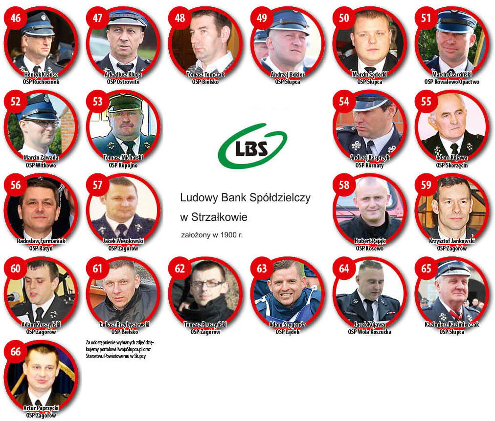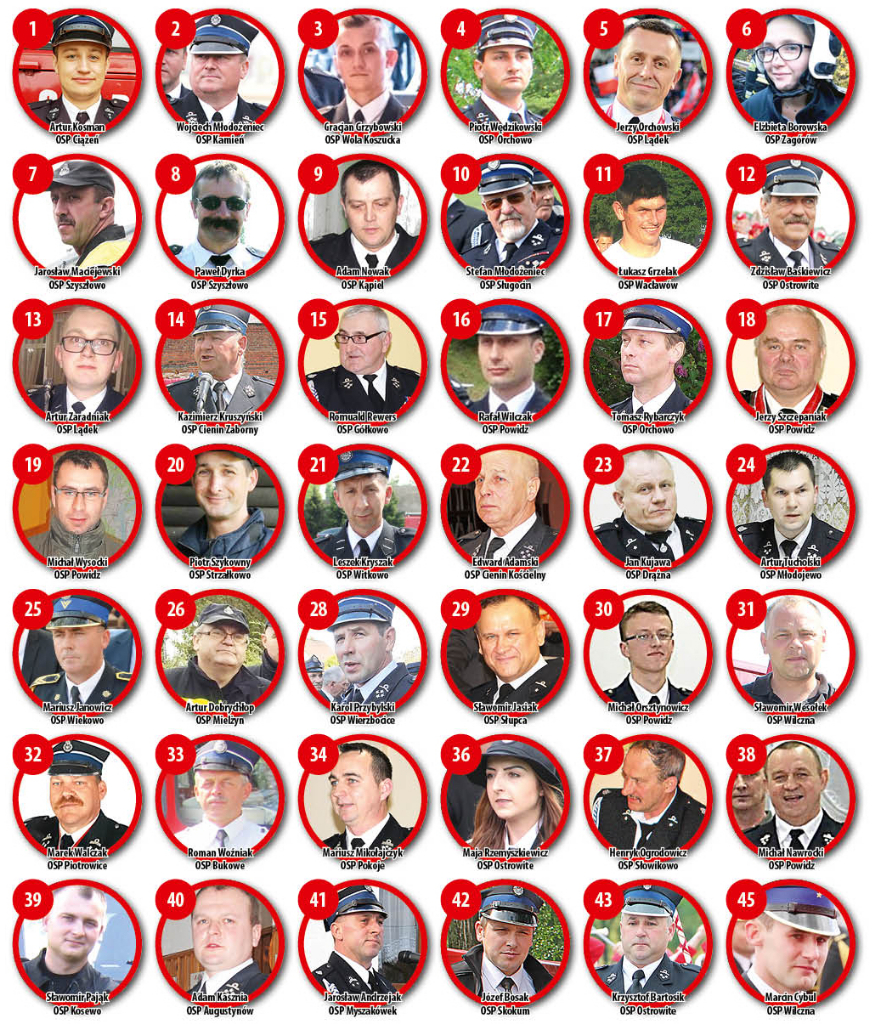 O każdej porze dnia i nocy niosą pomoc mieszkańcom naszego terenu. Często organizują też życie społeczne w swoich miejscowościach. Pełni pasji i zaangażowania. Tacy są strażacy ochotnicy. Kolejny plebiscyt chcemy właśnie im poświęcić. Osób z naszego terenu, które zasługują na tytuł SuperStrażaka jest całe mnóstwo. Nasi Czytelnicy oraz grono redakcyjne nominowało 115 druhen i druhów. Teraz wszystko w Waszych rękach. Tytuł SuperStrażaka i 1.000 zł ufundowane przez partnera plebiscytu – Ludowy Bank Spółdzielczy w Strzałkowie otrzyma osoba, która uzyska najwięcej Państwa głosów. Już jutro na facebooku Ludowego Banku Spółdzielczego w Strzałkowie zamieścimy zdjęcia wszystkich nominowanych. Wówczas rozpocznie się głosowanie internetowe i smsowe (szczegóły głosowania podamy przy zdjęciach na facebooku). Z kolei w najbliższym numerze Kuriera znajdą Państwo kupony, za pośrednictwem których również będzie mogli głosować na swoich faworytów. Tymczasem przedstawiamy wszystkich nominowanych.