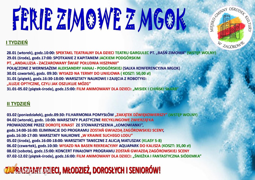 Program Ferii Zimowych 2020 już gotowy! Nie zabraknie atrakcji zarówno dla dzieci , dorosłych jak i seniorów. Zapraszamy do korzystania z ofert. Do zobaczenia!